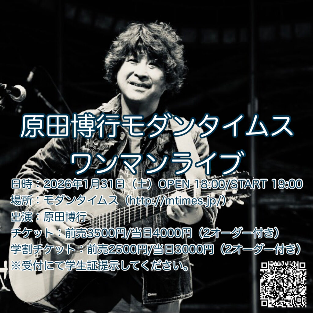 【原田博行ワンマンライブ@京都・モダンタイムス】 一人きりで語り弾き。 ○京都・モダンタイムス(一人で語り弾き) 日時:2026年1月31日(土)OPEN 18:00/START 19:00 場所:モ