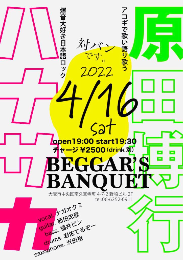 いよいよ明日です!大阪でのライブ。 ぜひぜひお越しください! 【4月16日大阪・BEGGAR’S BANQUET】 近づいてきました! 久しぶりに一人きりで歌います。対バンはハナサカ。 日程:2022
