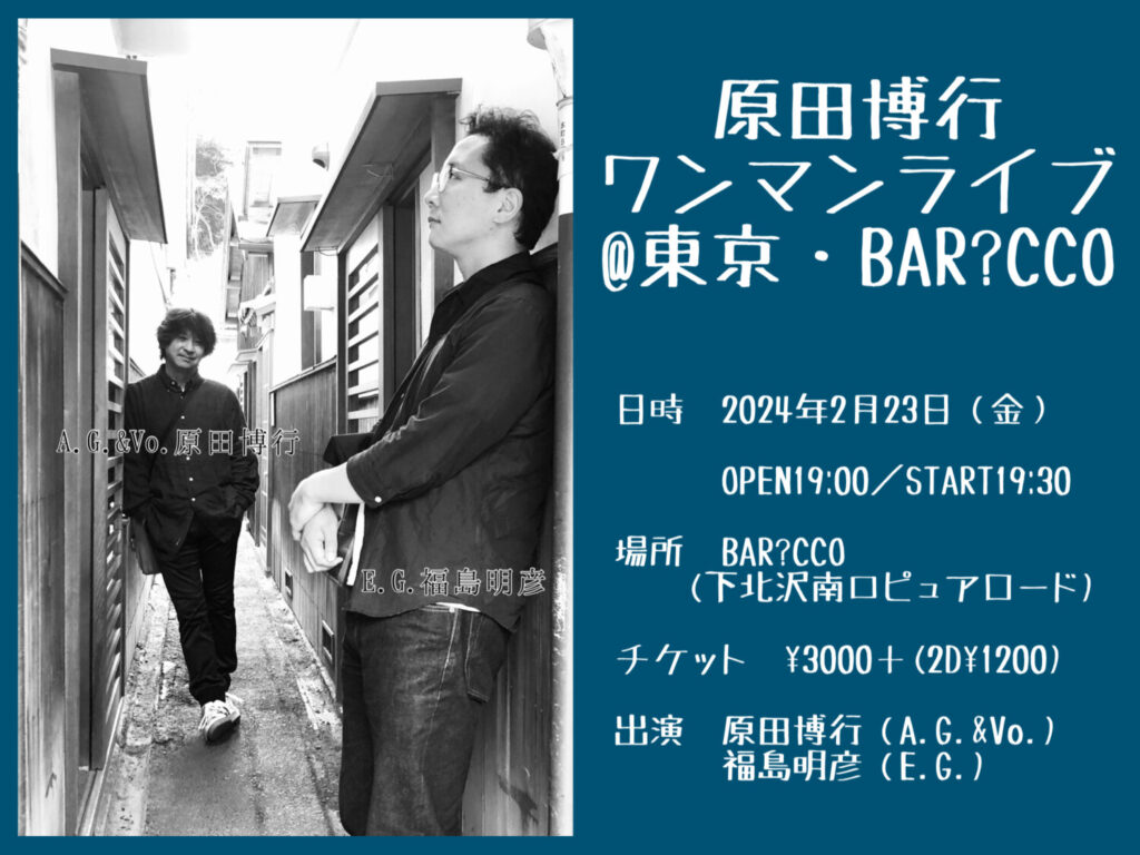 毎週金曜日に発行のメルマガに掲載している最新情報の詳細です! 【東京・BAR?CCO】 いよいよです!下北沢。 エレキギター福島くんと二人でやります。まだお席あります。 心からお待ちしています。 原田