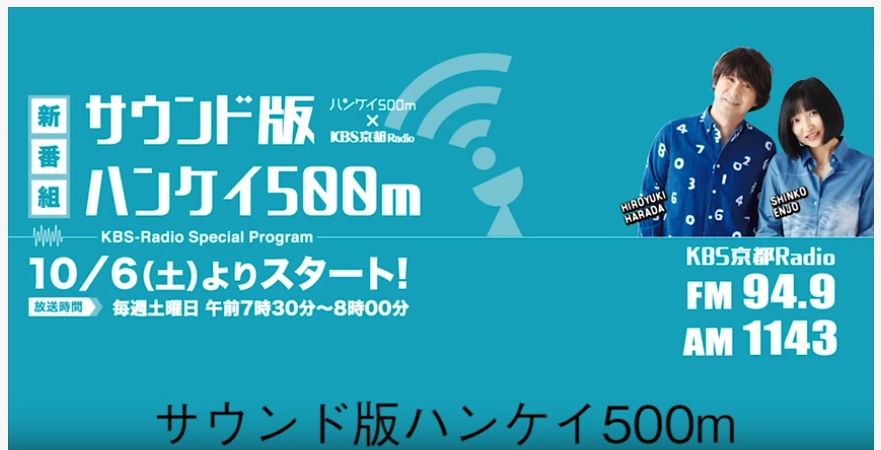 https://youtu.be/QWfqmtz9exE 毎週土曜日夕方5時からのKBS京都ラジオの番組。 RADIOハラダイスは、この番組からのスピンオフとも言える。 ハンケイ500m編集長の円城新