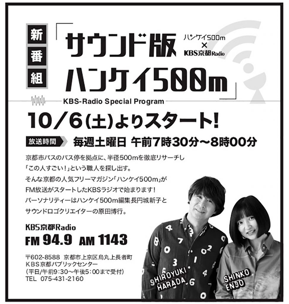 10月からラジオ番組にレギュラーで出演することになった。KBS京都の新しい番組だ。 「サウンド版ハンケイ500m」と言う番組。 京都で人気の「ハンケイ500m」と言うフリーマガジンから飛び出したラジオ