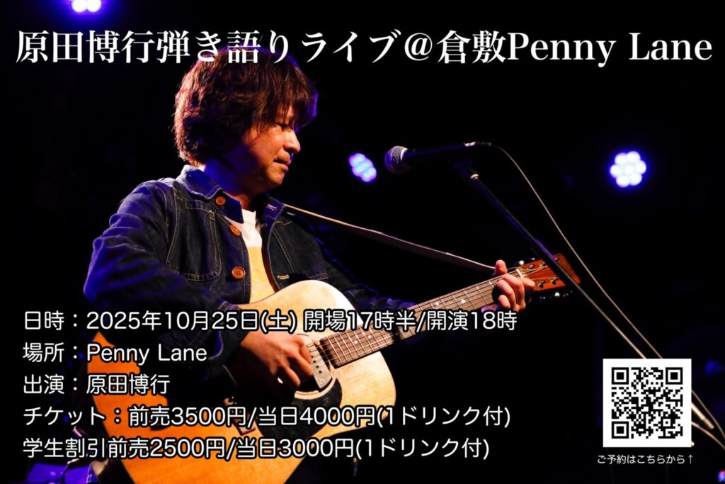 倉敷で久しぶりにやります。 一人きりでゆっくり歌います! 日時:2025年10月25日(土)17時半開場・18時開演 場所:Penny Lane 出演:原田博行 チケット:前売3500円/当日400