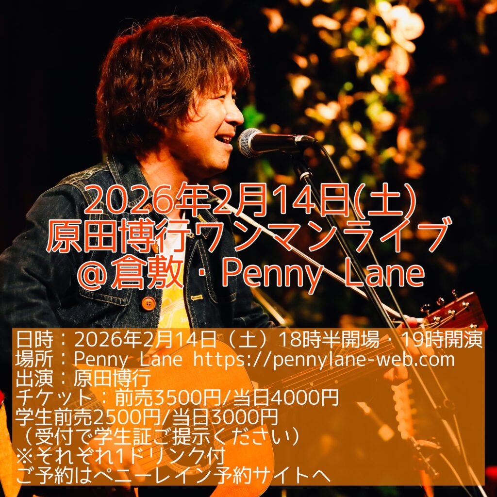 倉敷でのライブが急遽決まりました! お近くの方ぜひ!! 日時:2026年2月14日(土)18時半開場・19時開演 場所:Penny Lane 出演:原田博行 チケット:前売3500円/当日4000円